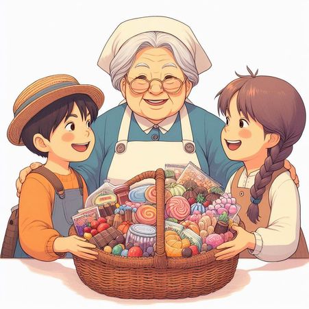 할머니: "여기, 아이들아. 이것을 먹으면 배가 고프지 않단다. 이 달콤한 간식들로 힘을 내고, 숲은 위험하니까 항상 조심하렴. 그리고 이쪽으로 가면 더 재미난 것을 볼수 있단다."