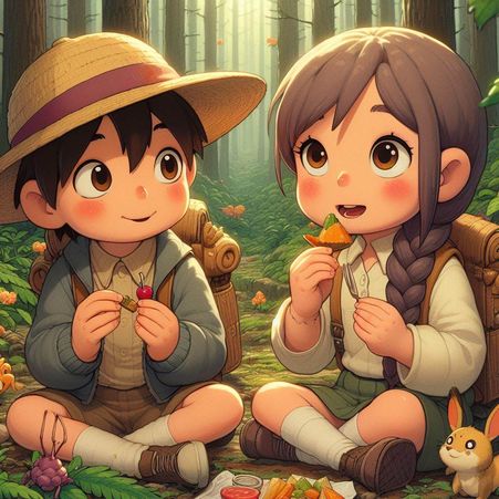 쌍둥이는 간식을 먹으며 숲을 더 깊이 탐험했어요.